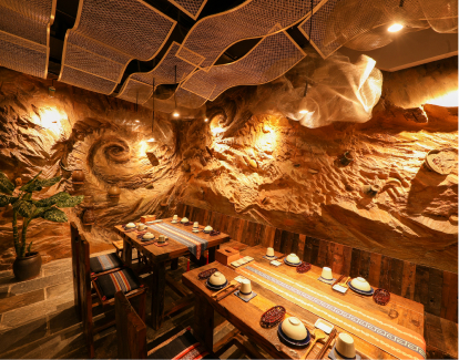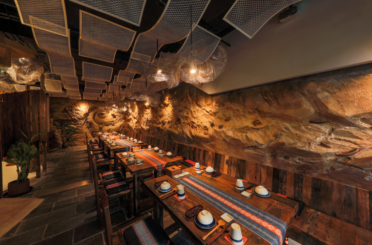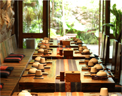 Tạo ra một không gian độc đáo với khoảng không rộng rãi mang theo âm hưởng núi rừng. Đồng thời khéo léo đan xen những vách ngăn từ gỗ, cây, len, sợi dệt để tạo ra những bàn ăn dễ chịu và riêng tư. A Bản mong bạn có thể tận hưởng không khí, màu sắc dân tộc trọn vẹn mà vẫn có khoảng không cho riêng mình.