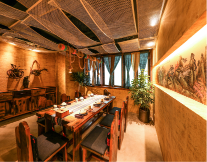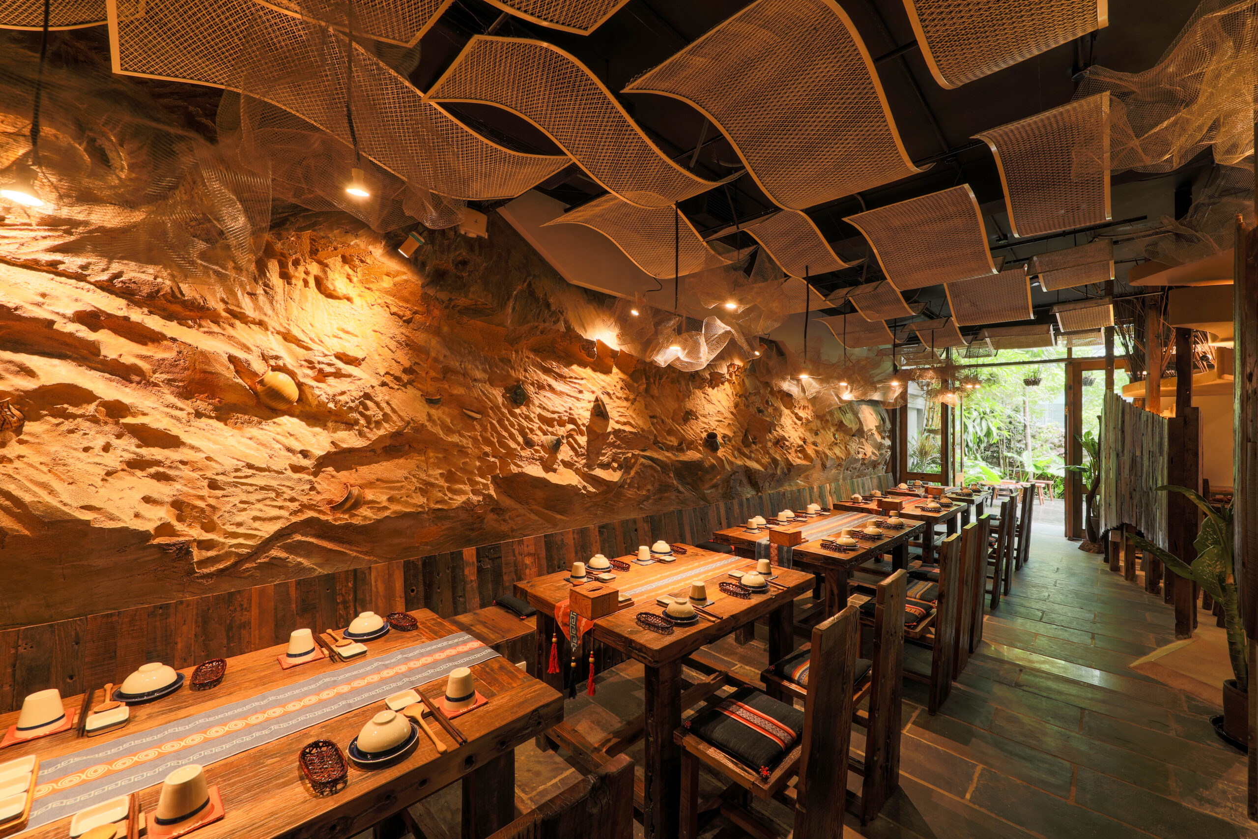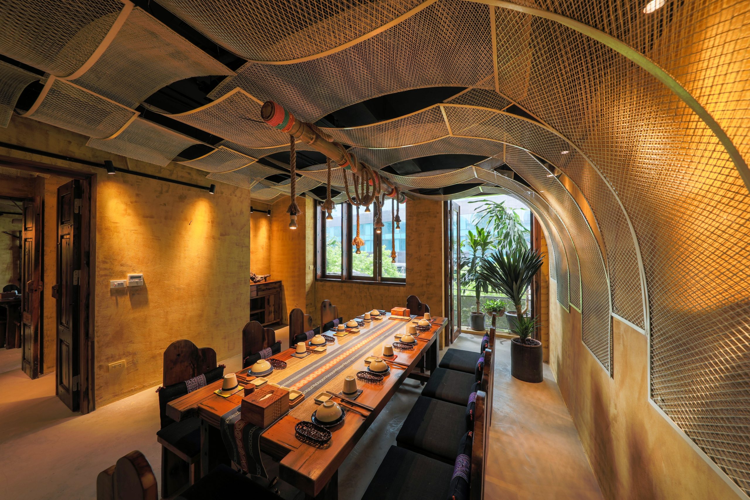 Tạo ra một không gian độc đáo với khoảng không rộng rãi mang theo âm hưởng núi rừng. Đồng thời khéo léo đan xen những vách ngăn từ gỗ, cây, len, sợi dệt để tạo ra những bàn ăn dễ chịu và riêng tư. A Bản mong bạn có thể tận hưởng không khí, màu sắc dân tộc trọn vẹn mà vẫn có khoảng không cho riêng mình.
